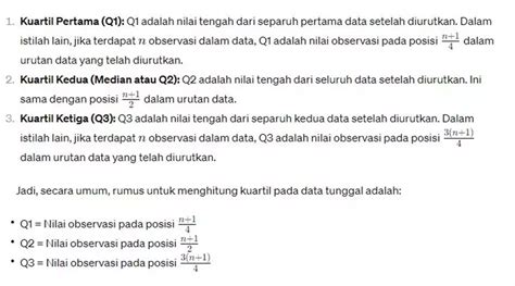 Pada paragraf kedua, kami menjelaskan secara detail tentang cara menghitung kuartil. Terdapat beberapa metode yang dapat digunakan, termasuk metode quartile-1 (Q1), quartile-2 (Q2), dan quartile-3 (Q3). Masing-masing metode memiliki rumus yang berbeda, tetapi pada dasarnya melibatkan pengurutan data, mencari posisi kuartil, dan menghitung nilai kuartil dengan mempertimbangkan jumlah data.